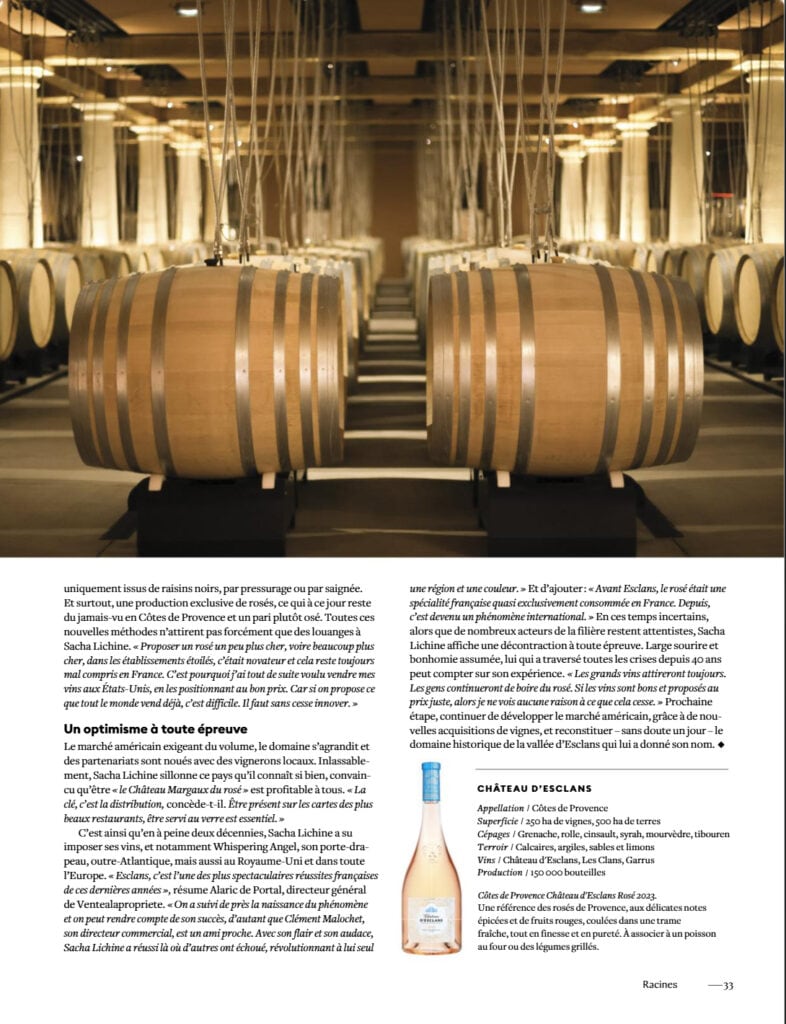 Ο δημιουργός του, ο ταλαντούχος οινοποιός Sacha Lichine, το θεωρεί ένα ροζέ για τη «νέα γενιά». Ευκολόπιοτο, με το χαρακτηριστικό ροζ-γκρι χρώμα των ροζέ της Προβηγκίας και χαρακτήρα που συνδυάζει αρωματική ένταση με γευστική φρεσκάδα και καθαρό τελείωμα. Με βιδωτό καπάκι και με «ινσταγκραμική» ετικέτα, επαναπροσδιορίζει για άλλη μια φορά την κατηγορία του ροζέ κρασιού, δημιουργώντας κάτι εντελώς νέο και επιβλητικό.