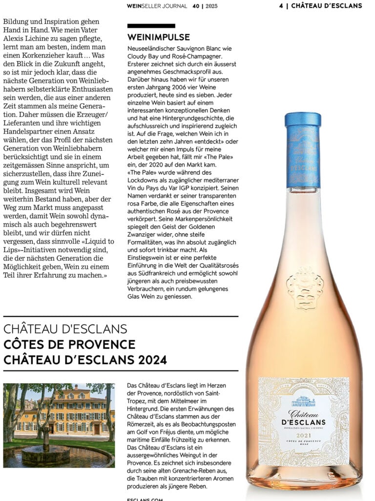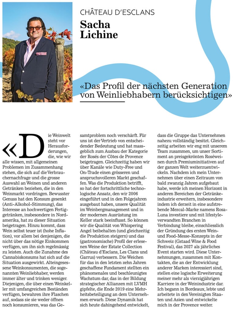 CHÂTEAU D’ESCLANS Sacha Lichine “Considering the Profile of the Next Generation of Wine Lovers” “The wine world is facing challenges that, as we all know, are related to broader problems related to consumer demand and the wide variety of wines and other beverages penetrating the wine market. Conscious drinking has reduced consumption (anti-alcohol sentiment), and interest in high-quality ready-to-drink beverages, particularly in North America, has contributed to this situation. In addition, wine itself is expensive (high inflation), especially among those who don’t have the income to afford it regularly. The rise in cannabis use has also affected the situation. Long-standing wine consumers, the so-called wine lovers, are getting older and drinking less. Those with a wine cellar with extensive stocks are storing their bottles, so they neither open nor consume them, which exacerbates the overall problem.