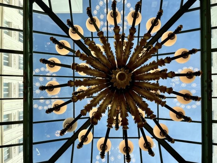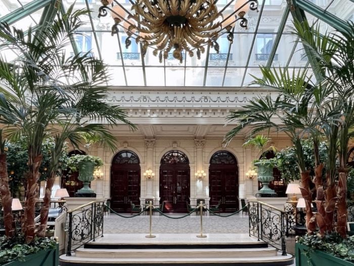 Beyond the open-plan lobby and reception area with its intricate floral arrangements and polished marble floors, my partner and I entered the Salon Verrière, or grand conservatory, a classic Belle Époque world topped with a tall metal dome resembling that of the Grand Palais or the Musée d’Orsay. This expansive living room is a resting place for guests, adorned with palm and citrus trees, brass railings, richly textured carpets, gold-leaf-framed mirrors, chandeliers, ornate pillars, and stucco on the ceiling. Groups of lamps hanging on the walls, more like nineteenth-century lanterns, are a strong reminder of this past glory era. We felt like royalty.